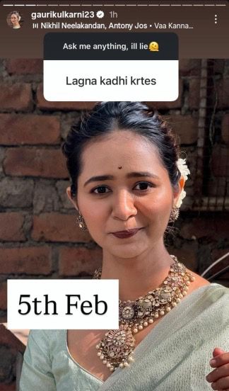 गौरीनं इन्स्टाग्रामवरील प्रश्नोत्तरांच्या सेशनद्वारे चाहत्यांशी संवाद साधला. यावेळी एका चाहत्यांनं तिला लग्न कधी करतेस? असं विचारलं. या प्रश्नाचं उत्तर देत थेट तिने तिच्या लग्नाची तारीखच सांगून टाकली. गौरीनं ५ फेब्रुवारीला लग्न करणार असल्याचं या उत्तरामध्ये सांगितलं. आता खरंच गौरी लग्न करणार का याकडे तिच्या चाहत्यांच्या नजरा लागून राहिल्या आहेत.