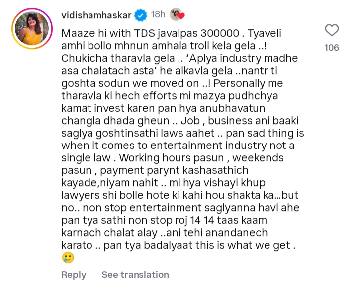 मात्र, मालिका संपून पाच वर्षे झाली तरी काही कलाकारांना अद्याप मानधन मिळालेलं नाही, असा आरोप आता समोर येत आहे. शशांकच्या या पोस्टनंतर बहुतेक कलाकारांनी कमेंट करत आपल्यासोबतही असाच अनुभव आल्याचं सांगितलं. ज्यामध्ये अभिनेत्री विदिशा म्हसकरने देखील आपली बाजू मांडली आहे. सध्या ‘पिंगा गं पोरी पिंगा’ या मालिकेत काम करणाऱ्या विदिशा म्हसकरने शशांकच्या पोस्टवर कमेंट करत लिहिलं की,”माझेही टीडीएससह जवळपास तीन लाख रुपये बाकी आहेत. त्यावेळी आम्ही बोललो म्हणून आम्हाला ट्रोल केलं गेलं, चुकीचं ठरवलं गेलं. आपल्या इंडस्ट्रीमध्ये असं चालतच असतं. नंतर ती गोष्ट सोडून आम्ही पुढे गेलो.”