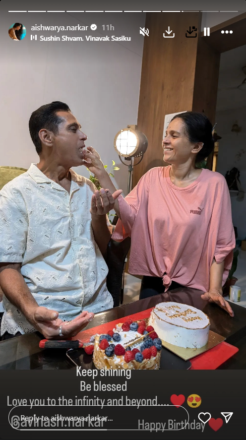 ऐश्वर्या व अविनाश हे सोशल मीडियावर कायमच सक्रीय असतात. दोघे एकमेकांबरोबरचे डान्स व्हिडिओ शेअर करत चाहत्यांच्या संपर्कात राहत असतात. त्यांचे हे व्हिडीओ चाहत्यांच्यादेखील विशेष पसंतीस पडतात. अहस्तच ऐश्वर्या यांनी त्यांच्या पतीला वाढदिवसानिमित्त शुभेच्छा दिल्या आहेत. ऐश्वर्या यांनी त्यांच्या इन्स्टाग्राम स्टोरीवर अविनाश नारकरांबरोबरचा फोटो शेअर केला आहे. ज्यामध्ये ऐश्वर्या अविनाश यांना केक भरवत आहेत आणि हाच खास फोटो शेअर करत त्यांनी अविनाश यांना त्यांच्या वाढदिवसानिमित्त शुभेच्छा दिल्या आहेत.