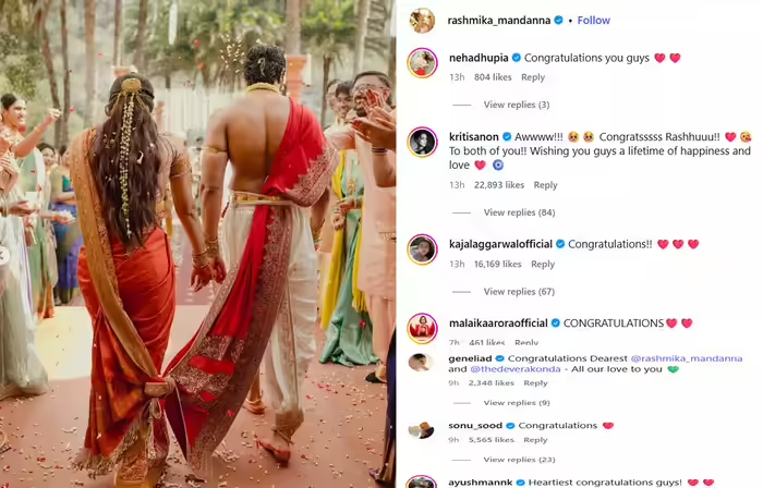 रकुल प्रीत सिंहने देखील सोशल मीडियावर पोस्ट केले आणि लिहिले की, “तुमचे हृदय नेहमी जोडलेले राहो आणि तुमचे घर शांती आणि आनंदाने भरले जावो. या सुंदर लग्नासाठी तुम्हा दोघांचे अभिनंदन”. मलायका अरोरानेही रश्मिकाच्या पोस्टवर या जोडप्याचे अभिनंदन केले. जेनेलिया डिसूझाने लिहिले, “रश्मिका आणि विजय देवरकोंडा यांचे अभिनंदन, आमच्याकडून खूप प्रेम”. सोनू सूद, क्रिस्टल डिसूझा, हंसिका मोटवानी, मोना सिंग, स्मृती खन्ना, काजल अग्रवाल आणि अदिती राव हैदरी यांसारख्या अनेक स्टार्सनी तिला लग्नासाठी शुभेच्छा दिल्या.