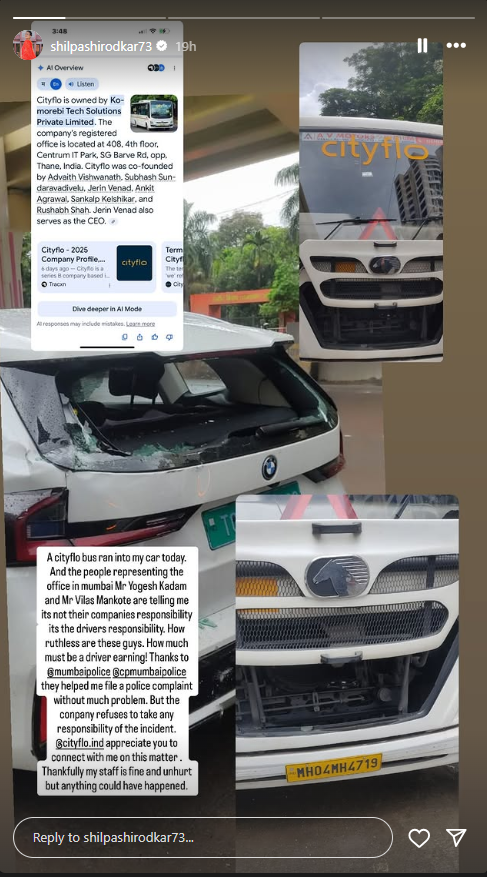 अभिनेत्रीने सोशल मीडियावर या अपघाताची बातमी चाहत्यांना दिली आहे. इतकंच नाहीतर या अपघातात अभिनेत्री सुखरूप असल्याचंही समजलं आहे. पोस्ट शेअर करत अभिनेत्री म्हणाली, “आज सिटीफ्लोची एक (Cityflo) बस माझ्या गाडीला धडकली आणि त्यांच्या मुंबईतील ऑफिसचे प्रतिनिधी योगेश कदम आणि विलास मांकोटे सांगत आहेत की ही त्यांच्या कंपनीची जबाबदारी नाही, ती चालकाची जबाबदारी आहे. किती निर्दयी लोक आहेत हे. चालकाला असा किती पगार असेल”.