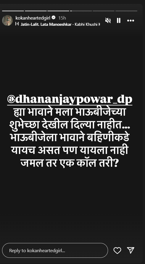या स्टोरीमध्ये अंकिता म्हणते, “धनंजय पोवार या माझ्या भावाने मला भाऊबीजेच्या शुभेच्छा देखील दिल्या नाहीत. भाऊबीजेला भावाने बहिणीकडे यायचं असतं पण, यायला नाही जमलं तर एक कॉल तरी?”. अंकिताची ही स्टोरी रिशेअर करत धनंजय म्हणतो, “भाऊ दिवाळीच्या व्यापारात व्यग्र होता वाटलं होतं बहिणीने समजून घेतले असेल पण, आता हीच माझी एक चूक समजून तुला लवकरच गिफ्ट देईन ते तुला नक्कीच आवडेल”.