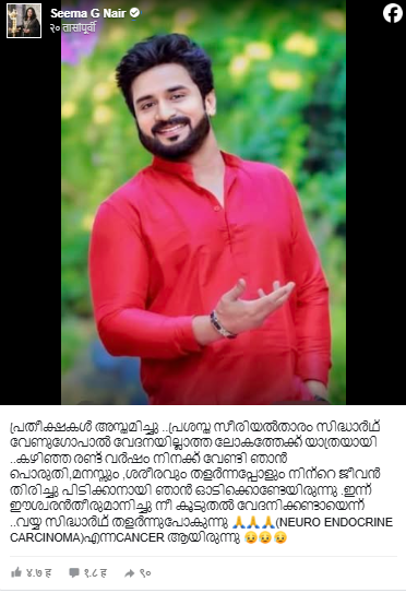 अभिनेत्याबाबत लिहीत आणि दु:ख व्यक्त करत अभिनेत्री सीमा जी नायर यांनी सोशल मीडियावर एक भावनिक चिठ्ठी शेअर केली, ज्यात लिहिले आहे, “सर्व आशा संपल्या आहेत… लोकप्रिय मालिका अभिनेता सिद्धार्थ वेणुगोपाल आता अशा जगात गेला आहे जिथे कोणतेही दुःख नाही… गेली दोन वर्षे मी तुझ्यासाठी लढत राहिले, माझे मन आणि शरीर पूर्णपणे थकले असतानाही मी धावत राहिले… आज तुझा जीव वाचवायचा नाही हे देवाने ठरवले आहे. मला पाहिजे… मला हे सिद्धार्थ सहन होत नाही, मी पूर्णपणे तुटले आहे”.