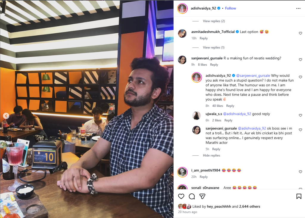 आदिशने चाहतीच्या प्रश्नावर कमेंट करत असं म्हटलं की, “असा मूर्खासारखा प्रश्न तुम्ही का विचारत आहात? मी कोणाची खिल्ली उडवलेली नाही. हा जोक मी माझ्यावर केलेला आहे. तिला प्रेम मिळालं यासाठी मी आनंदी आहे. आणि ज्याला कोणाला आयुष्यात प्रेम मिळालं त्या सगळ्यांसाठी मी आनंदी आहे. पुढच्या वेळी बोलण्याआधी विचार करा”. यावर त्या चाहतीनं रिप्लाय करत लिहिलं की, “तुझी क्रिकेटची पोस्ट सोशल मीडियावर व्हायरल होत होती, म्हणून मला वाटलं”. आदिशने क्रिकेट खेळतानाची पोस्ट केली होती. ही पोस्ट शेअर करत आदिशने ‘तू खेळ बिनधास्त मी आहे तुझ्यासोबत, अशा मुलीसोबत लग्न करायचं आहे’ असं लिहिलं होतं.