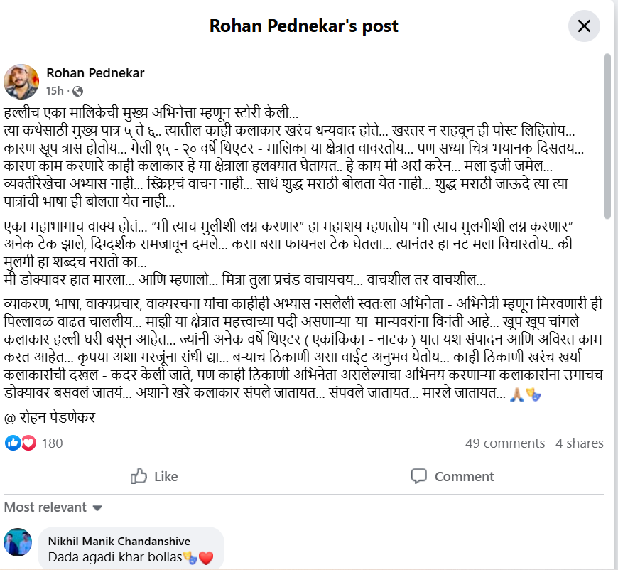 रोहनने पोस्ट शेअर करत असं म्हटलं की, “हल्लीच एका मालिकेची मुख्य अभिनेता म्हणून स्टोरी केली. त्या कथेसाठी मुख्य पात्र पाच ते सहा. त्यातील काही कलाकार खरंच धन्यवाद होते. खरंतर न राहवून ही पोस्ट लिहितोय. कारण खूप त्रास होत आहे. गेली १५ – २० वर्षे थिएटर, मालिका या क्षेत्रात वावरतोय पण सध्या चित्र भयानक दिसत आहे. कारण, काम करणारे काही कलाकार हे या क्षेत्राला हलक्यात घेत आहेत. हे काय मी असं करेन. मला सहज जमेल. व्यक्तिरेखेचा अभ्यास नाही. स्क्रिप्टचं वाचन नाही. साधं शुद्ध मराठी बोलता येत नाही. शुद्ध मराठी जाऊ दे. त्या-त्या पात्रांची भाषाही बोलता येत नाही”.