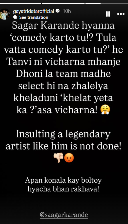 प्रेक्षकांपाठोपाठ आता मराठी अभिनेत्री आणि ‘बिग बॉस’ फेम गायत्री दातारनेही तन्वीची शाळा घेतली आहे. एपिसोड पाहिल्यानंतर गायत्रीने एक स्टोरी पोस्ट करत तन्वीला सुनावलं आहे. गायत्रीने पोस्ट शेअर करत तन्वीला म्हटलं, “सागर कारंडे यांना ‘कॉमेडी करतो तू! तुला वाटतं कॉमेडी करतो तू?’ हे तन्वीने विचारणं म्हणजे धोनीला टीममध्ये सिलेक्टही न झालेल्या खेळाडूने खेळात येतं का?, असं विचारणं. एखादया महान कलाकाराचा अपमान करणं हे चूक आहे. आपण कोणाला काय बोलतोय याचं भान राखावं”, असं म्हणत कानउघडणी केली.