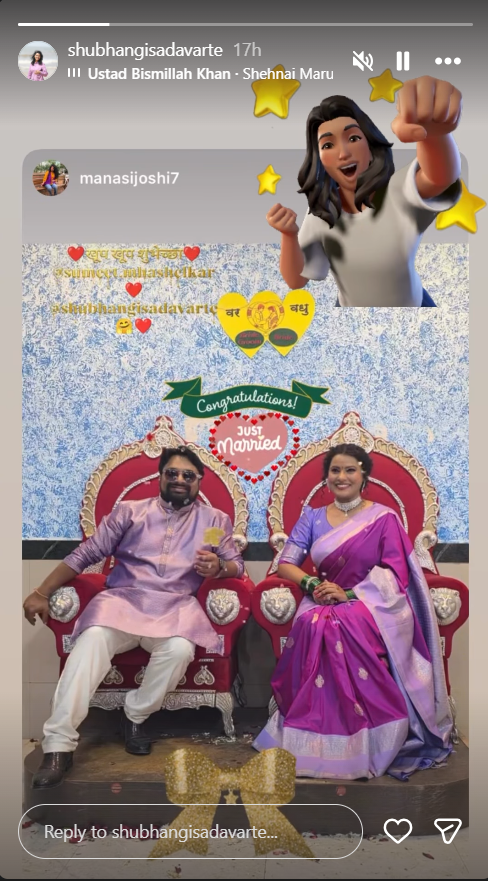 शुभांगीने तिच्या इंस्टाग्रामवर एक स्टोरी रिपोस्ट केली आहे. ज्यात ती व सुमित खुर्चीवर बसलेले दिसत आहेत. आणि दोघांचाही साधेपणा लक्ष वेधून घेत आहे. लग्नसाठी शुभांगीने जांभळ्या रंगाची साडी नेसली आहे. यावेळी तिने कोणतेच भरजरी दागिने, भरजरी साडी, लेहंगा या सगळ्याला पसंती न दर्शिविता साधेपणाची निवड केली आहे.