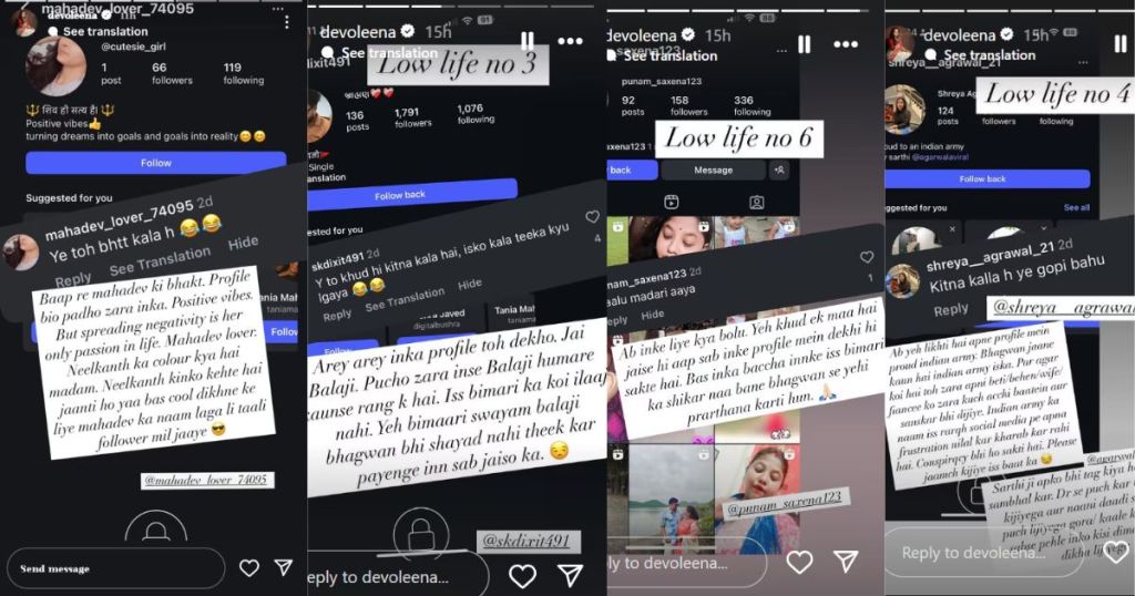 दुसर्या व्यक्तीने देवोलिनाच्या मुलाच्या फोटोवर लिहिले, “हा खूप काळा आहे”. यावर अभिनेत्रीने उत्तर दिले, |बाप रे महादेवाचे भक्त. प्रोफाइल बायो पहा यांचा. सकारात्मक व्हाइब्स. परंतु जीवनात नकारात्मकता पसरवणे ही त्याची एकमेव आवड आहे. महादेव प्रेमी, नीळकंठचा रंग काय आहे आपल्याला माहित आहे का?, मुळात नीलकंठ काय आहे हे तरी माहित आहे का?, की नुसती हवाबाजी आणि फॉलोअर्स वाढवणायसाठी महादेवांचे फोटो पोस्ट करता”.