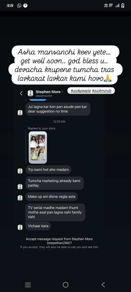 त्या मेसेजमध्ये नेटकऱ्याने म्हटलं होतं “जुई लग्न कर… कोणीही असूदे पण कर. टीआरपी कमी आहे, तुमचं मार्केटिंग कमी पडलंय. मेकअप वेगळा, दिसणं वेगळं. मालिकेत मोठ्या असाल पण लग्न नाही, कुटुंब नाही, विचार करा…”, असा चुकीच्या अर्थी आणि खासगी संदेश तिला पाठवला. यावर प्रतिक्रिया देताना जुई म्हणाली “अशा माणसांची कीव येते. लवकर बरे व्हा. देव तुम्हाला सद्बुद्धी देवो. #sickpeople #sickmind”. जुईने स्क्रीनशॉट शेअर करत त्या संबंधित इसमाची चांगलीच कानउघडणी केली.
