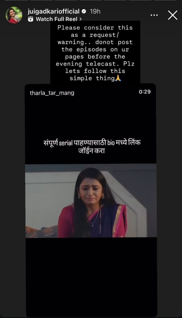 फॅनपेज करत असलेली चूक जुईच्या लक्षात येताच तिने इंस्टाग्राम स्टोरीद्वारे पोस्ट शेअर करत ‘कृपया असे करू नका’ असं म्हणत या फॅनपेजेसना आवाहन केलं आहे. अभिनेत्रीने शेअर केलेल्या पोस्टमध्ये ठरलं तर मग मालिकेचे झलक आणि संपूर्ण मालिका पाहण्यासाठी लिंक जॉईन करा असं म्हटलं आहे. ही पोस्ट शेअर करत सायली म्हणते, “कृपया ही विनंती समजा किंवा चेतावणी समजा. पण, अशाप्रकारे मालिकेचे एपिसोड टेलिव्हिजनवर टेलिकास्ट होण्याआधी शेअर करु नका. कृपया असं करु नका. आपण काही नियमांचं पालन करुयात”, अशी विनंती केली आहे.